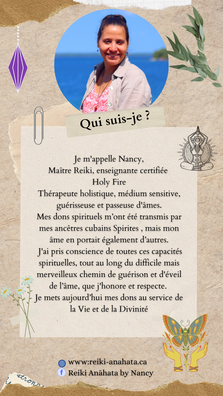 Je m'appelle Nancy, Maître et enseignante Reiki certifiée Holy Fire® III World Peace